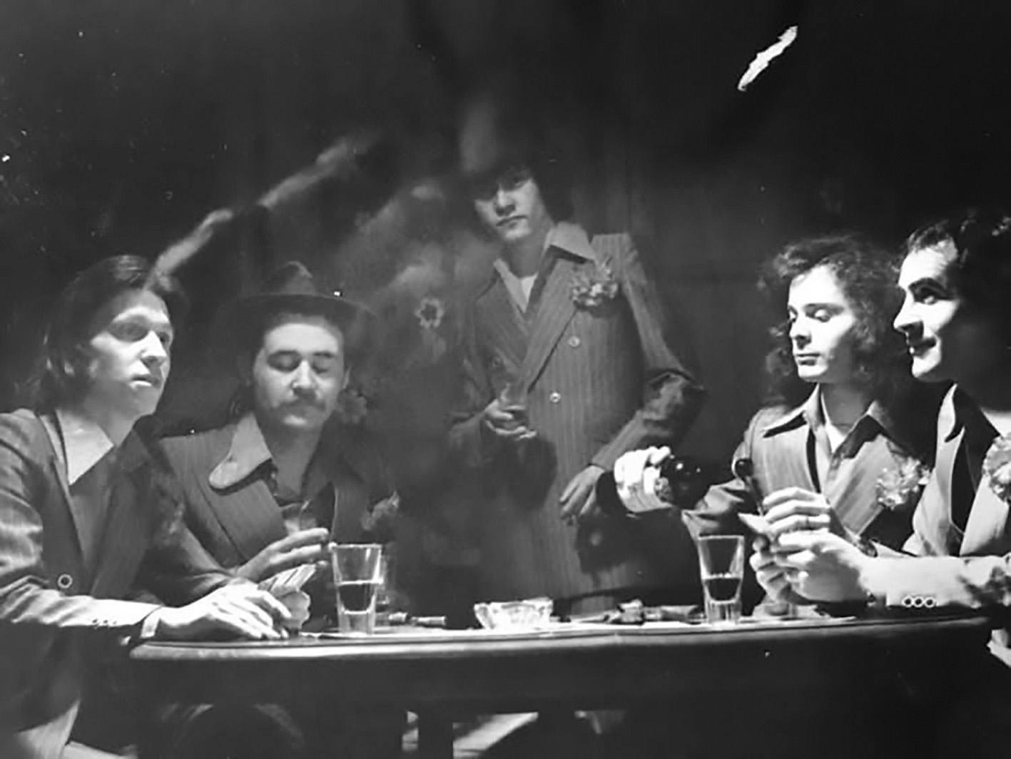 La belle photo ci-dessus, que j’aimerais bien pouvoir créditer, est la première photographie d’orchestre du Saumurois qui communique non sur la présence des musiciens avec leurs instruments, mais sur une ambiance cinématographique, l’atmosphère d’une partie de belotte qui va commencer dans l’arrière-salle d’un bar louche, c’est audacieux pour l’époque. De gauche à droite : Jacky Voyer (guitariste), ? (pianiste), ?, Michel Fazi (batterie et chant), Jean-Pierre Lion (basse et accordéon).