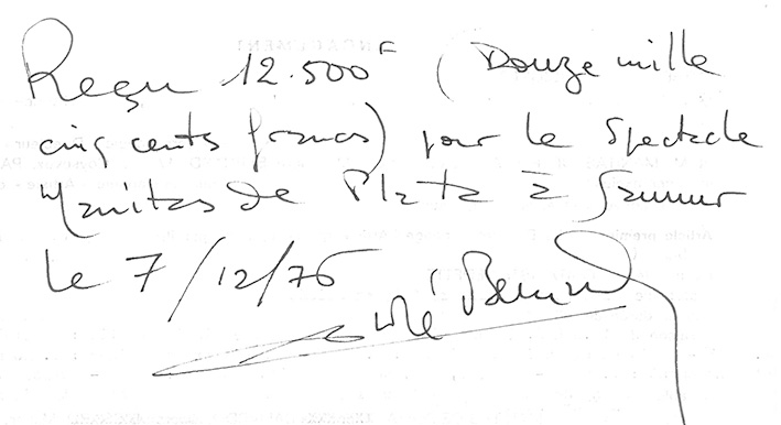 Les petites mains d’argent du guitariste invité pour le gala de la Jeanne d’Arc Basket grattent à guichet fermé pour un public enthousiaste le 7 décembre 1976 au théâtre. La presse, une fois de plus, s’interroge sur la nécessité d’une sonorisation aussi forte. Puisque la musique de scène est aussi une histoire de contrat et de cachet, voici des détails : pour sa représentation, Manitas de Plata, représenté par son impresario André Bernard, touche 4000 francs soit environ 3000 euros actuels, les artistes et musiciens gitans qui l’accompagnent 2000 francs ( le fils Manéro Baliardo, Manuel Arenas, le cousin et futur Gipsy Kings José Reyes), le conseiller artistique 1000 francs, le secrétariat et management 1300 francs + 230 francs de TVA, les frais d’affiche 1500 francs, les déplacements et séjour 1870 francs, soit la somme de 12500 francs payés en espèces à l’issue du concert et reçue par le manager (archives J.A. Basket Saumur):