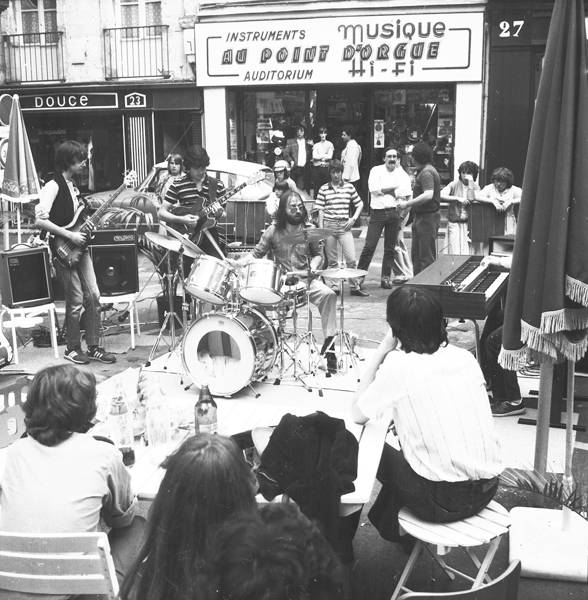 Ces deux photographies sont les premières prises lors des Fêtes de la musique. Ci-dessus, les deux jeunes à gauche, Rémy Léger le bassiste et Jean-YvesJeeveDucornet le guitariste, feront parler d’eux dès la fin d’année en créant un groupe qui marquera cette période. Au centre, c’est BernardNunusJean à la batterie, et les spécialistes de la musique de cette époque ont reconnu le jeu, le clavier (et les chaussures) de Pascal Marcault. En arrière-plan, AnneNanouGouin suit de près cette nouvelle animation.
