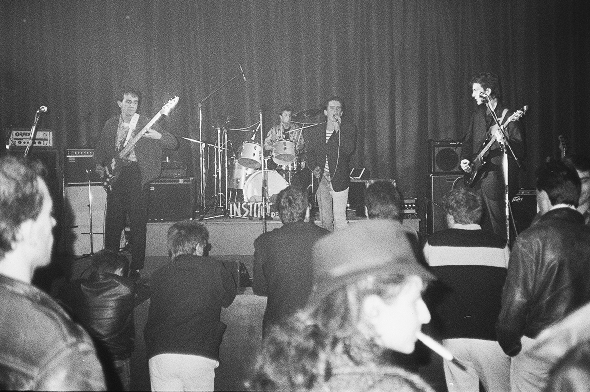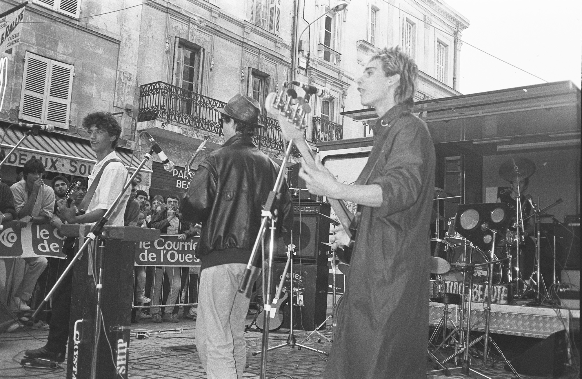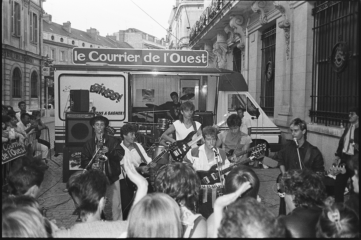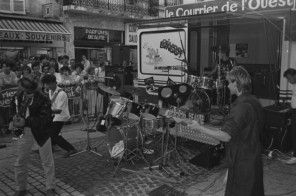 Sur la photo ci-dessus : Institut de Beauté, le 13 septembre 1985, en finale du concours d’orchestres du Courrier de l’Ouest/Radio-Saumur/Le Rallye, rue du Portail-Louis. À gauche, DominiqueGrabsMorisset, à droite Éric Bremaud et FrançoisShougPiriou, Nicolas Hotier est au centre, au saxo. Dans le public, le jeune barbu attentif est l’auteur de ces lignes.