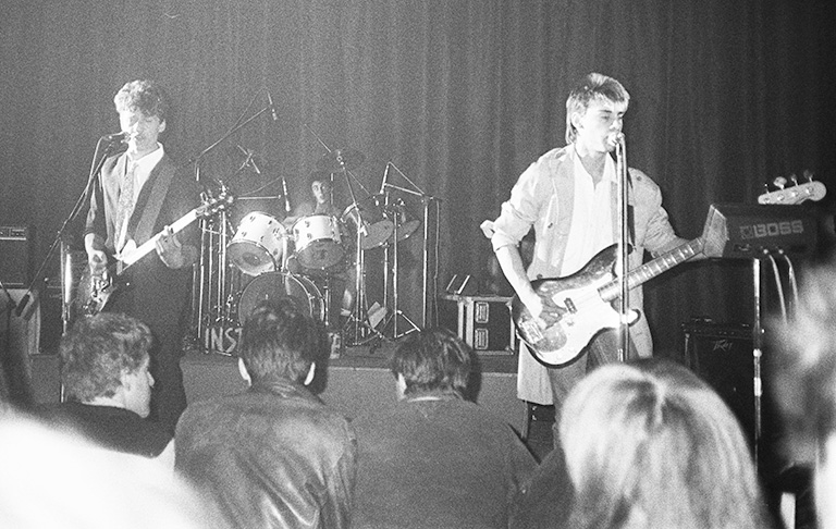 Dominique Grabs Morisset, à gauche, sapé comme un milord, lors de ses premiers concerts, ici avec Institut de beauté au théâtre de Doué-la-Fontaine, le 26 octobre 1985. Photo André Musso.