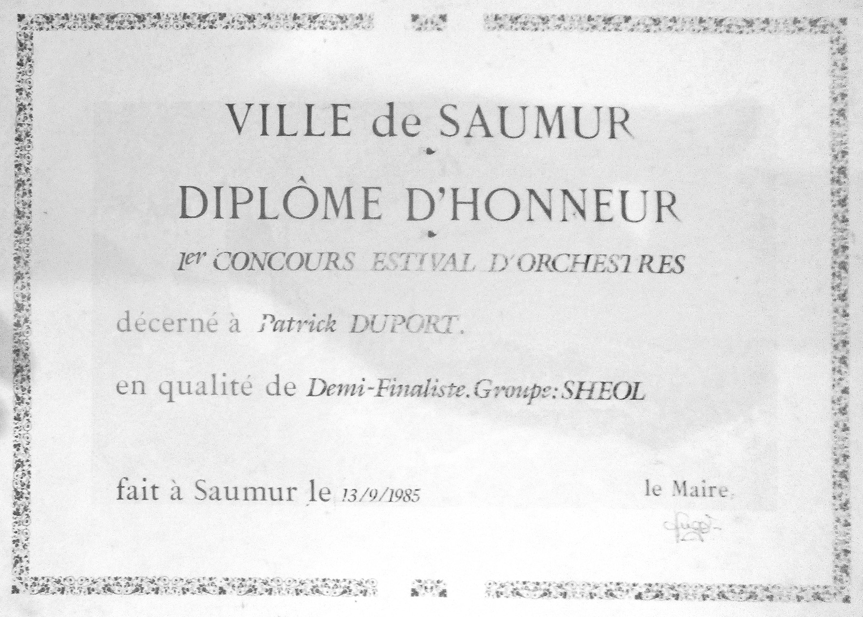 Sheol est l’un des rares groupes Saumurois qui appartient clairement au répertoire hard-rock et hard-core (Motörhead/AC/DC/Mötley Crüe) avec des reprises, mais aussi ses propres compositions en Français. Dans la Bible, Sheol est le séjour des morts (Le Nouveau testament utilise, lui, le nom grec Hadès, qui est aussi à l’époque le nom d’un groupe naissant de Longué). Shéol compte quatre musiciens : FrédéricP’tit FredGouin à la guitare solo, FrédéricFredGirard à la guitare rythmique, Patrick Duport à la batterie et OlivierP’tit BufBuf au chant. Pendant ses deux ans d’existence (1985/86), Sheol fait une dizaine de concerts dont l’un à la Fauvette de Tours, scène Hard du moment, et il a l’opportunité de répéter (le week-end) dans les locaux du Point d’Orgue. Les trois premiers groupes du tremplin d’orchestres organisé par Le Courrier de l’Ouest et Saumur-Radio en 1985 (Institut de Beauté, Crystal Ship et Sheol) reçoivent un diplôme de la part de la Ville de Saumur lors d’une remise de prix officielle le 19 décembre 1985, au Bar-tabac le Rallye, mazette !